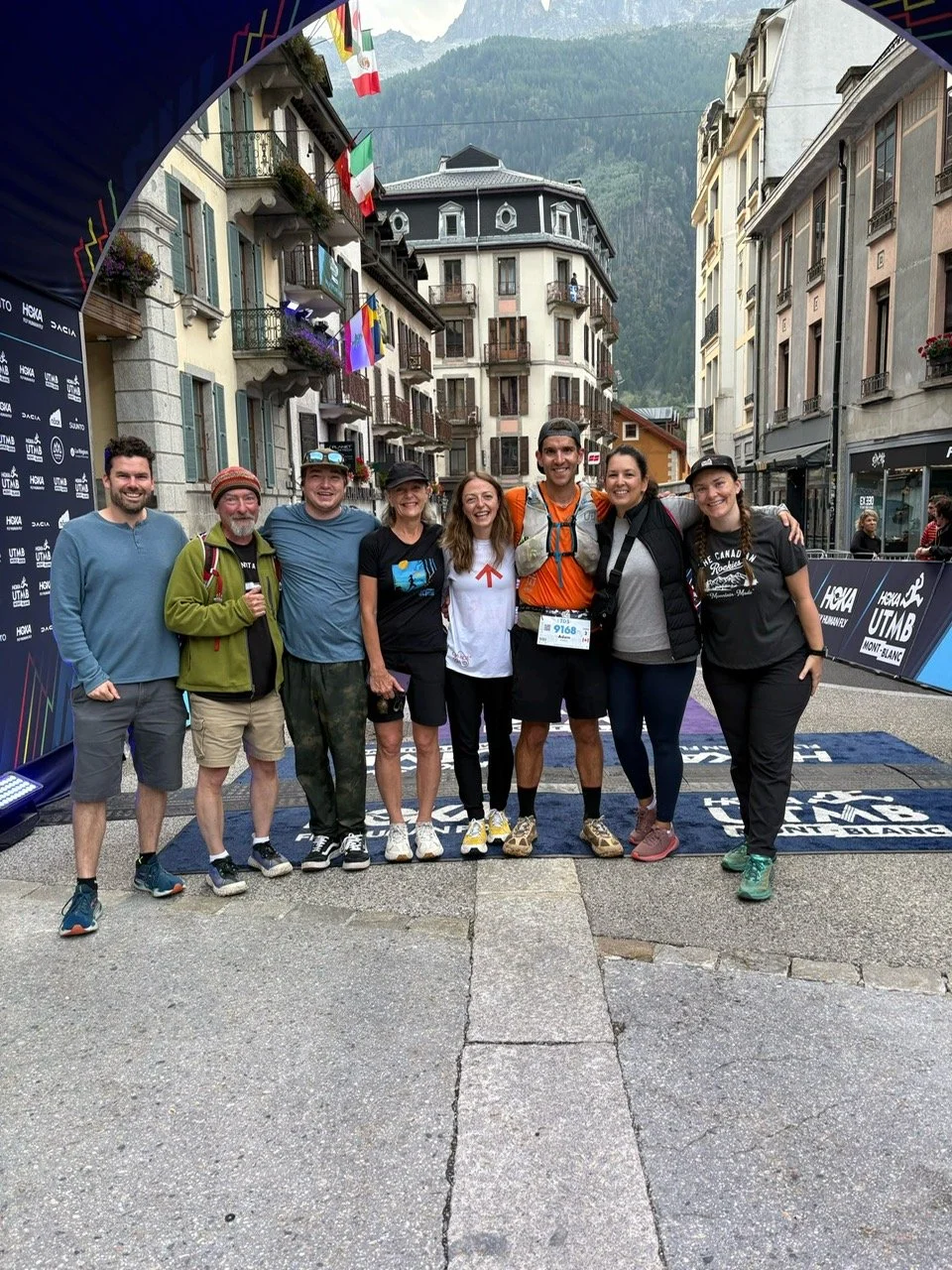 The whole crew with Kelsey at the finish line of UTMB 2025