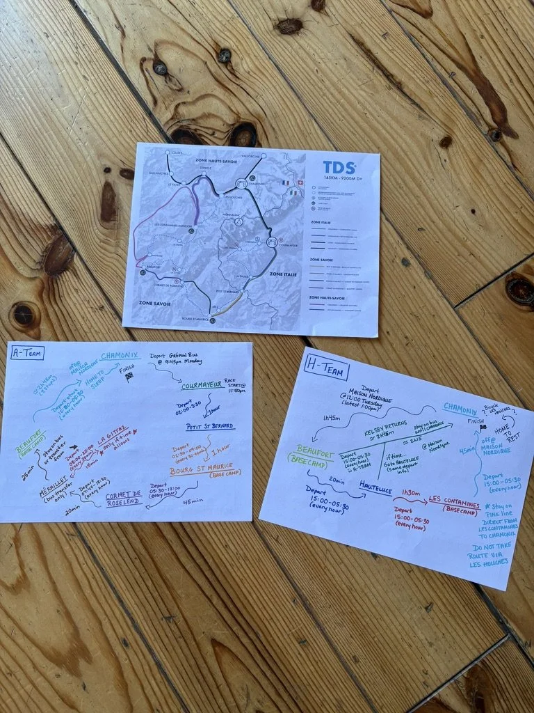 Sunday (T-1 day until TDS) was a day full of prep meetings, logistical planning, and aid-station rehearsals. The weather this year was going to be more of a factor than the previous year, and Adam’s race (along with just about every other race that week) already had a route change announced pre-departure to avoid exposed areas during a forecasted thunderstorm for Tuesday. While we were familiar with the crew bus routes and logistics for Kelsey’s race, TDS was a different beast. Even though the race length was similar to UTMB, there were only three crewed aid stations where we could directly assist Adam. With a departure on the other side of Mont Blanc in Courmayeur, Italy at midnight, and anticipated 2 overnights, planning (and flexibility) was key. To ensure crew members could get some rest over the next couple of days, Adam’s crew was split into 2 teams. The first team was me, Kelli-Nicole and Steven who would accompany Adam to Italy at the start line, follow him through the night and into France for one cheering spot in Petit St. Bernard (36.5km), then onto the first crewed aid station in Bourg St. Maurice (50.8km), another cheer spot at Cormet de Roselend (65.9km), and then onto the second crewed aid-station in Beaufort (92.3km). Beaufort would be where we would make the hand-off and switch crew teams so that Jane, Noel, and Riley could take over until the finish line. Kelsey was solely on the day shift, traveling to Beaufort with the second team, and back to Chamonix before the second overnight to ensure her own rest for her race later in the week. We would all then meet Adam at the finish line sometime Wednesday morning if all went to race plan.
